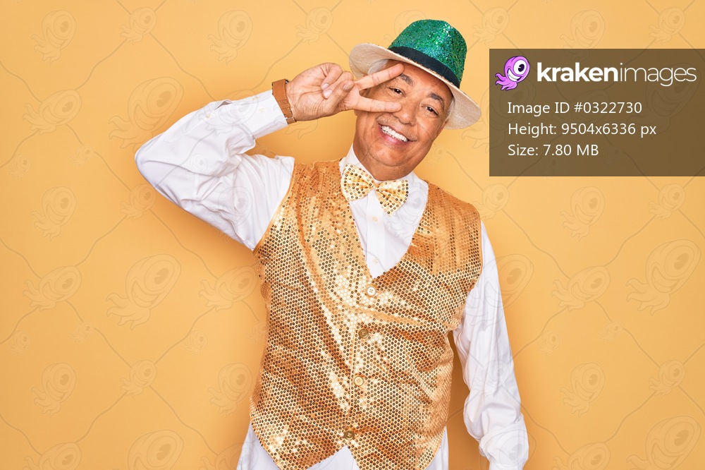 Middle age senior grey-haired man wearing Brazilian carnival custome over yellow background Doing peace symbol with fingers over face, smiling cheerful showing victory - Kraken Images