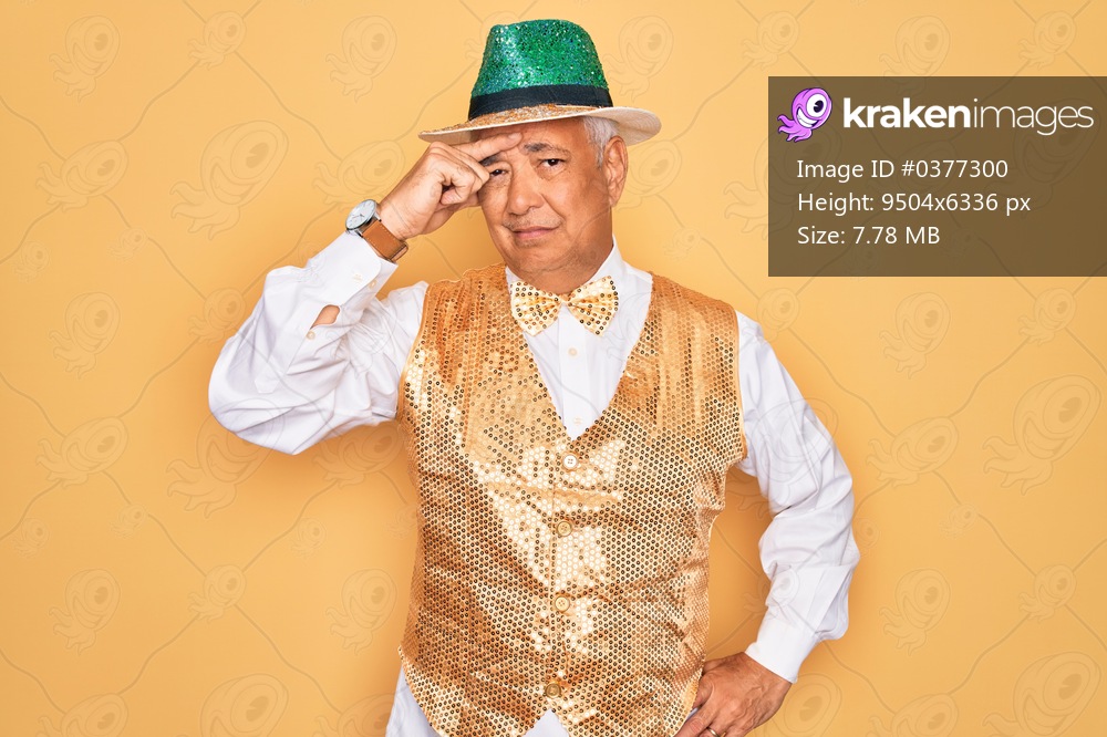 Middle age senior grey-haired man wearing Brazilian carnival custome over yellow background pointing unhappy to pimple on forehead, ugly infection of blackhead. Acne and skin problem - Kraken Images