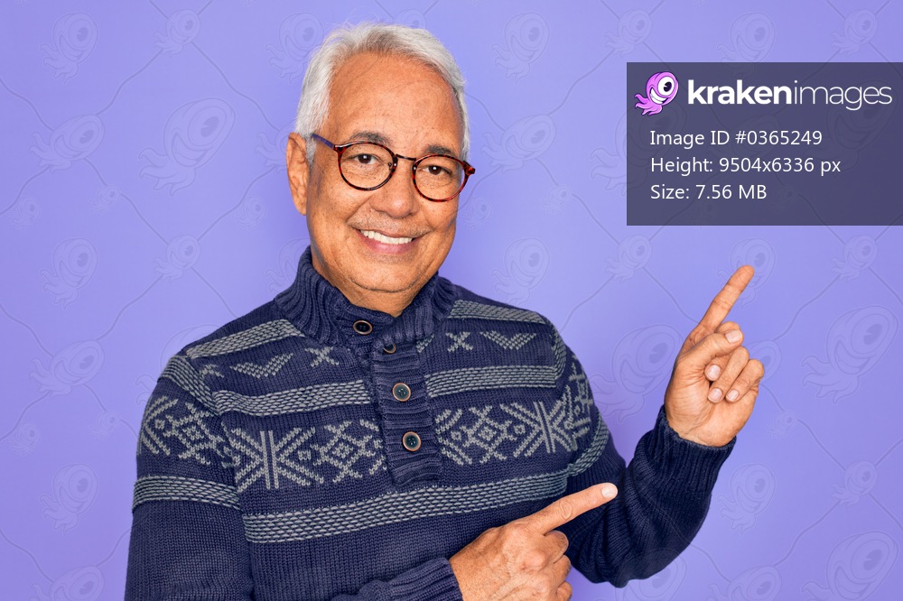 Middle age senior grey-haired man wearing glasses and winter sweater over purple background smiling and looking at the camera pointing with two hands and fingers to the side. - Kraken Images