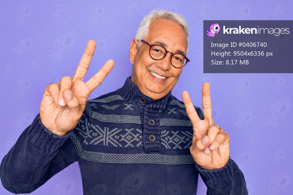 Middle age senior grey-haired man wearing glasses and winter sweater over purple background smiling looking to the camera showing fingers doing victory sign. Number two. - Kraken Images