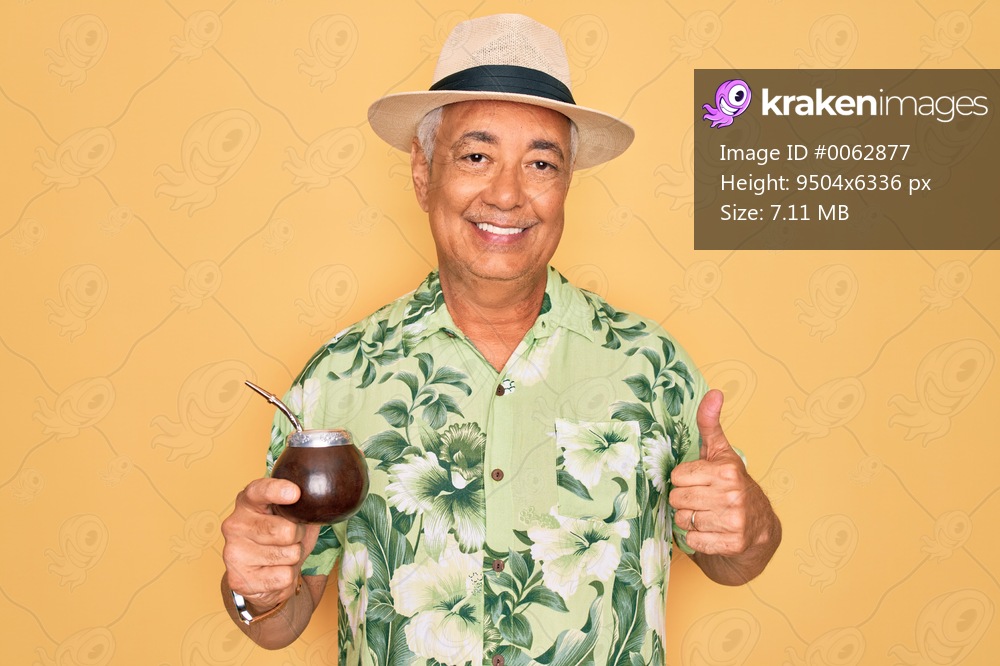 Middle age senior grey-haired man wearing summer hat drinking traditional mate drink happy with big smile doing ok sign, thumb up with fingers, excellent sign - Kraken Images