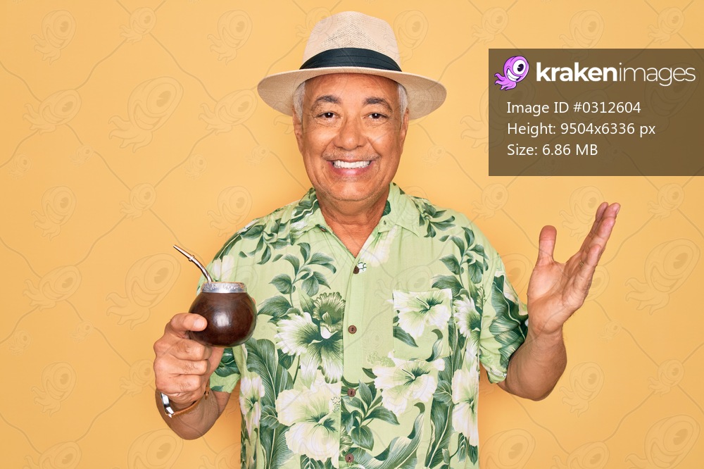 Middle age senior grey-haired man wearing summer hat drinking traditional mate drink very happy and excited, winner expression celebrating victory screaming with big smile and raised hands - Kraken Images
