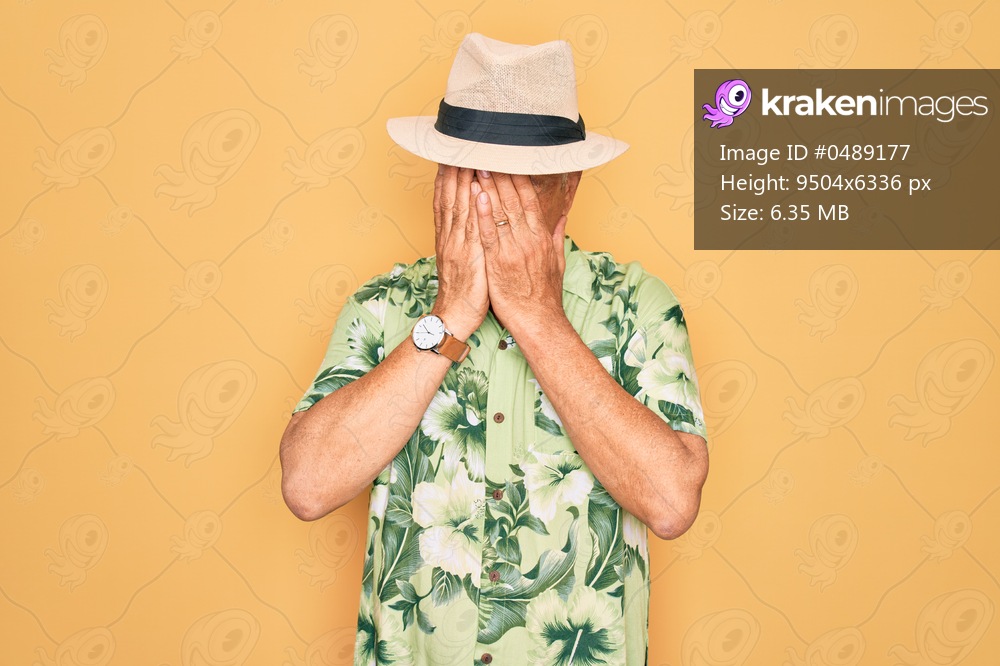 Middle age senior grey-haired man wearing summer hat and floral shirt on beach vacation with sad expression covering face with hands while crying. Depression concept. - Kraken Images