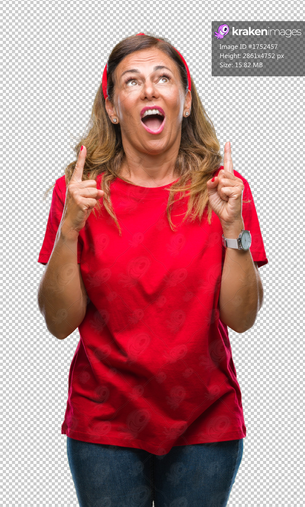 Middle age senior hispanic woman over isolated background amazed and surprised looking up and pointing with fingers and raised arms.