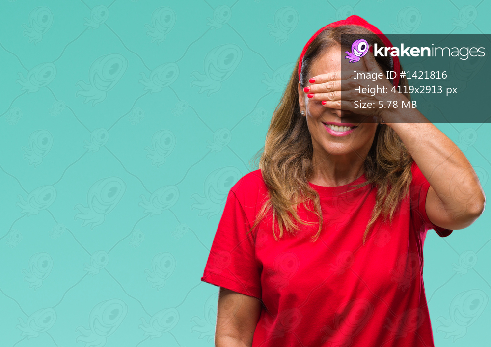 Middle age senior hispanic woman over isolated background smiling and laughing with hand on face covering eyes for surprise. Blind concept.