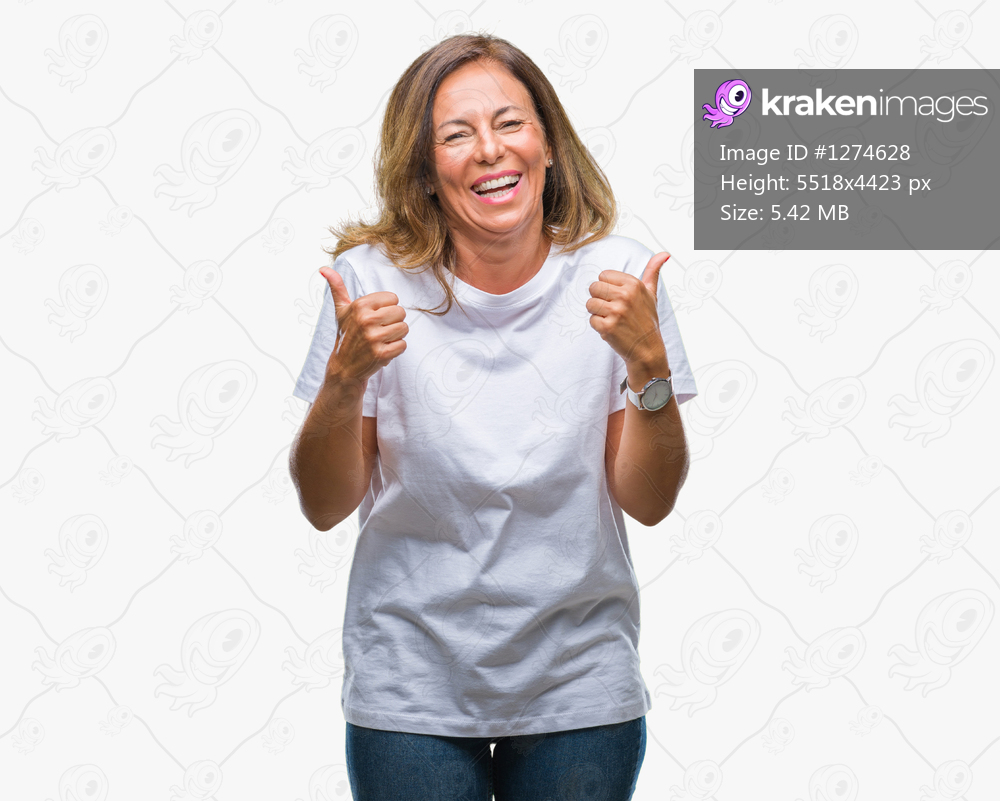 Middle age senior hispanic woman over isolated background success sign doing positive gesture with hand, thumbs up smiling and happy. Looking at the camera with cheerful expression, winner gesture. - Kraken Images