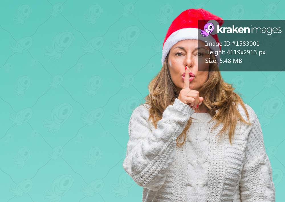 Middle age senior hispanic woman wearing christmas hat over isolated background asking to be quiet with finger on lips. Silence and secret concept.