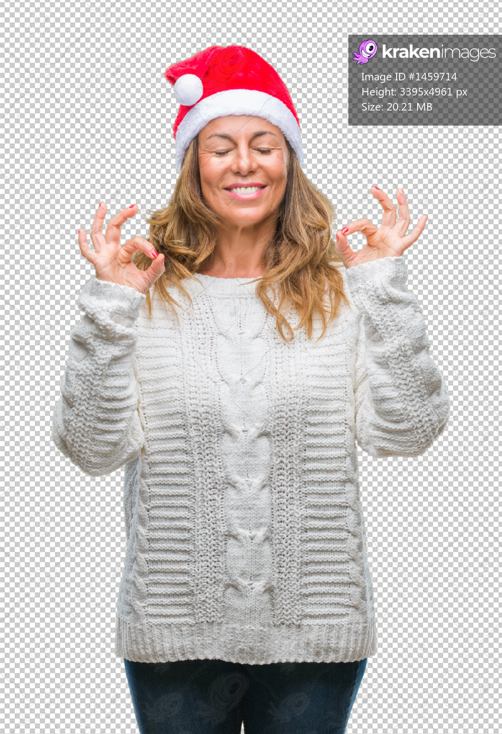 Middle age senior hispanic woman wearing christmas hat over isolated background relax and smiling with eyes closed doing meditation gesture with fingers. Yoga concept. - Kraken Images