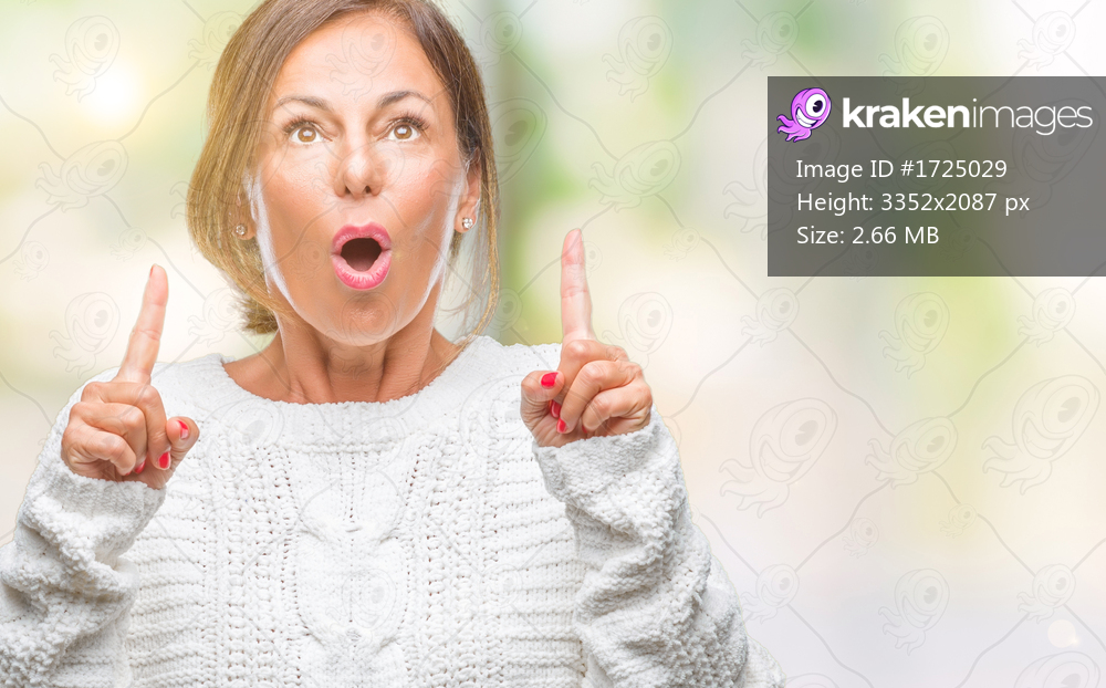 Middle age senior hispanic woman wearing winter sweater over isolated background amazed and surprised looking up and pointing with fingers and raised arms. - Kraken Images