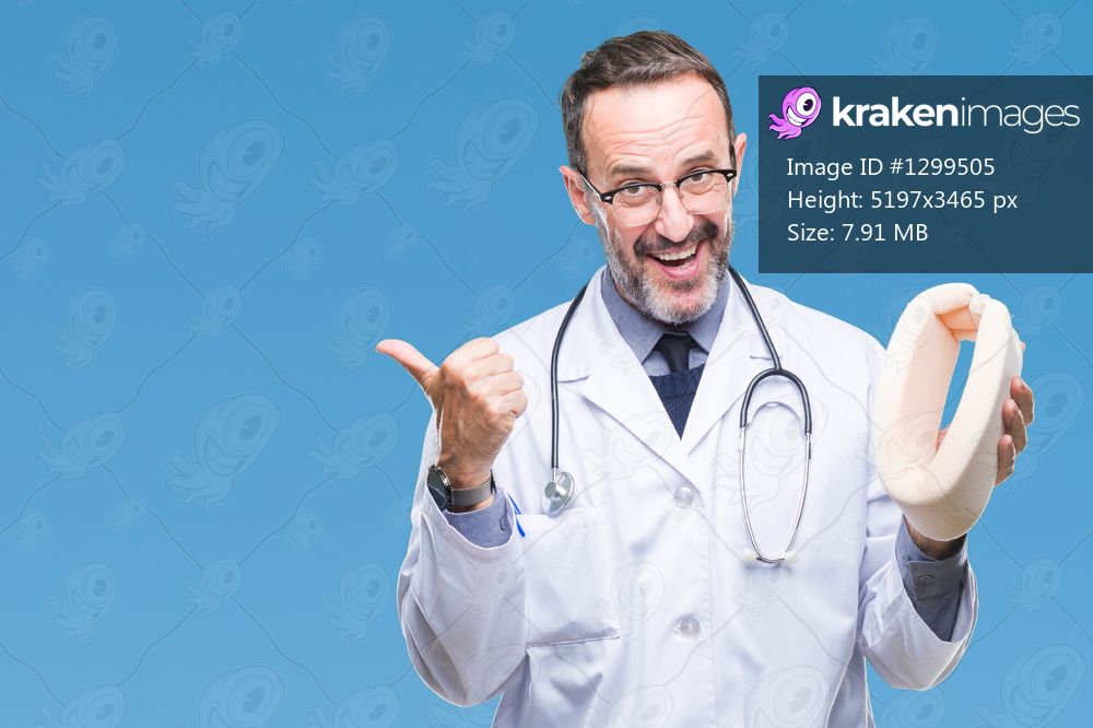 Middle age senior hoary doctor man holding neck collar over isolated background pointing and showing with thumb up to the side with happy face smiling