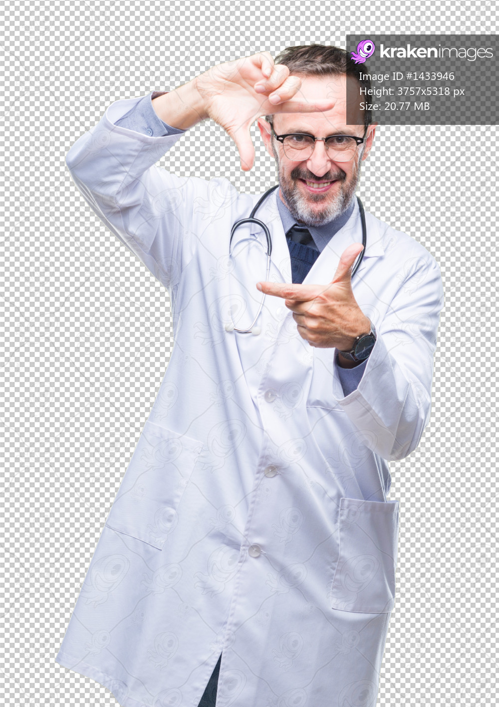 Middle age senior hoary doctor man wearing medical uniform isolated background smiling making frame with hands and fingers with happy face. Creativity and photography concept. - Kraken Images