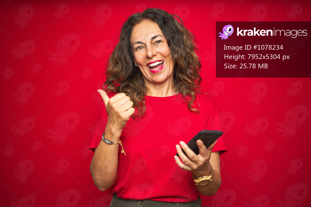 Middle age senior woman using smartphone over red isolated background pointing and showing with thumb up to the side with happy face smiling
