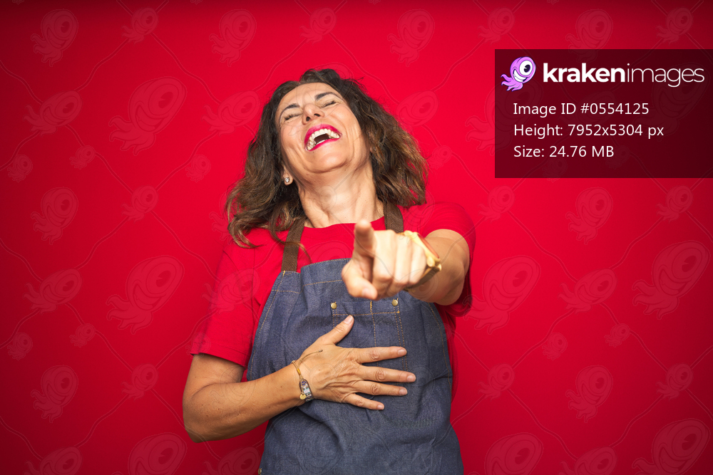Middle age senior woman wearing apron uniform over red isolated background laughing at you, pointing finger to the camera with hand over body, shame expression - Kraken Images