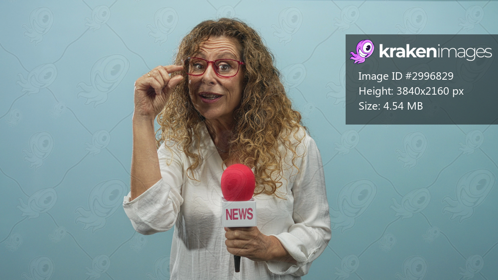 Middle age woman adjusts red glasses with her hand while holding a news microphone in studio; curiosity.