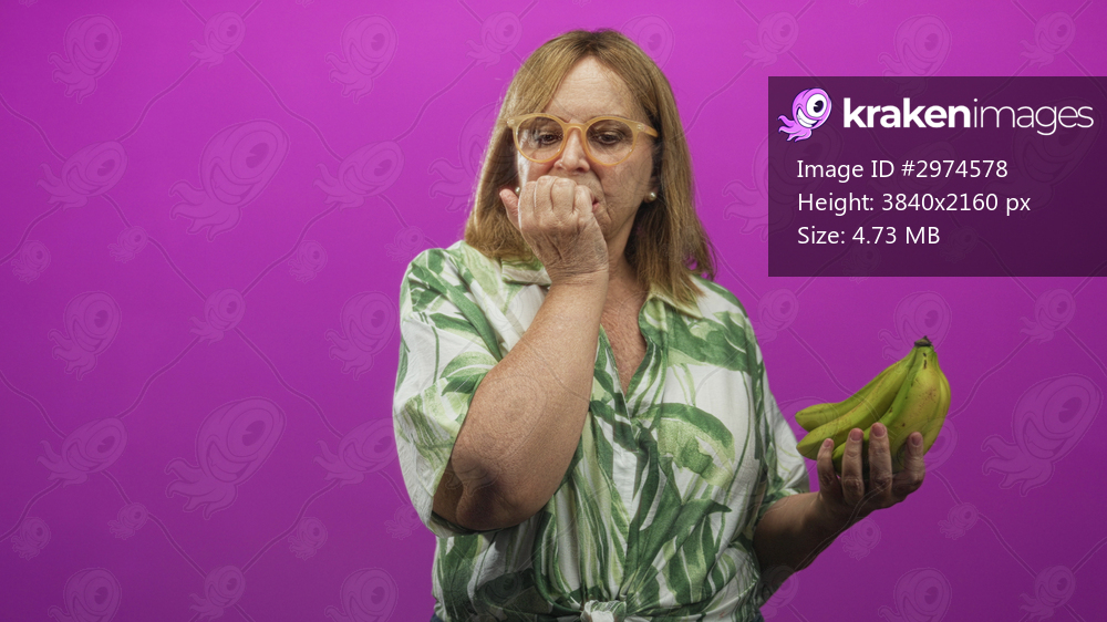 Middle age woman biting fingernail while holding bananas in studio; nervousness craving temptation hesitation.