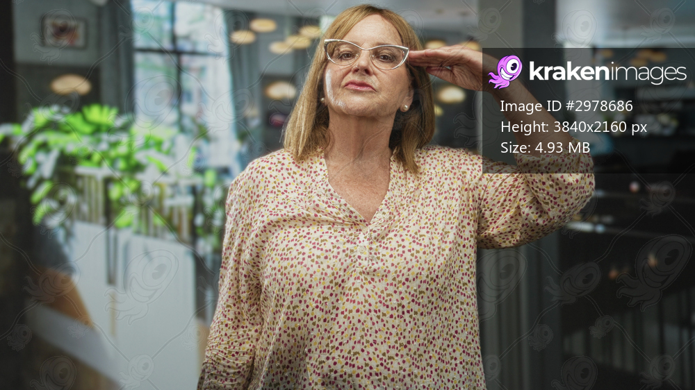 Middle age woman with blonde hair adjusts eyeglasses with right hand in a building lobby near potted plants and hanging lights, standing by a stair railing; confidence. - Kraken Images