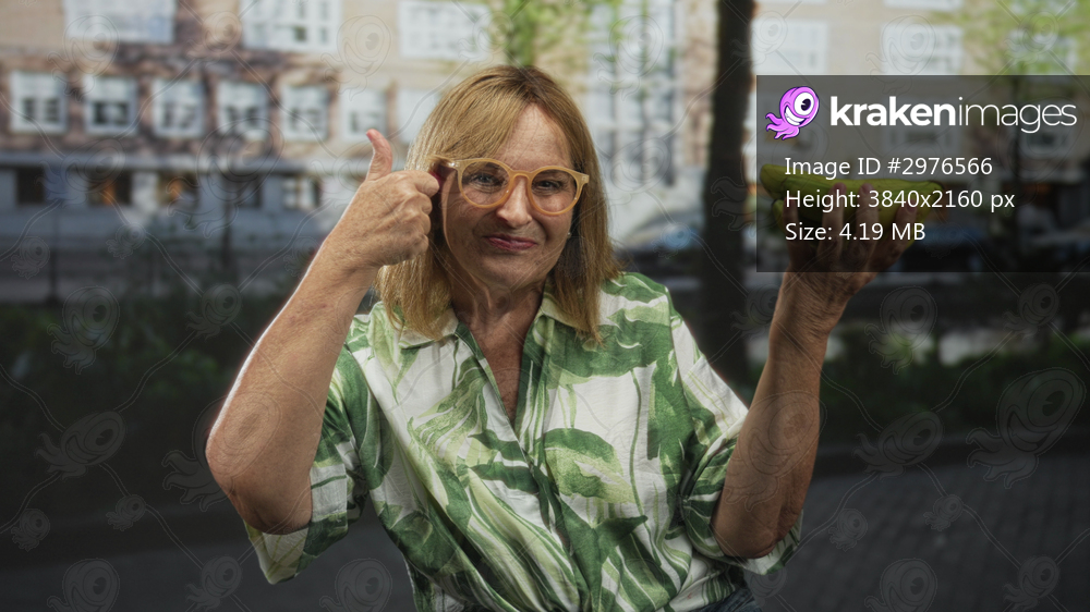 Middle age woman with blonde hair holding green bananas in right hand and giving thumbs up on a street with apartment building; playful approval.