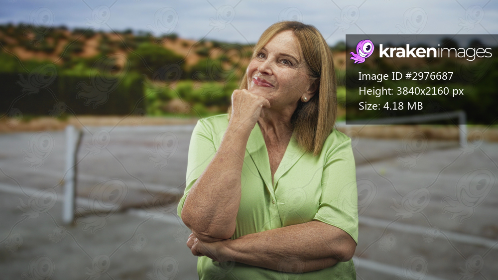 Middle age woman, blonde senior rests chin on hand with arm crossed on outdoor tennis court; quiet contemplation.