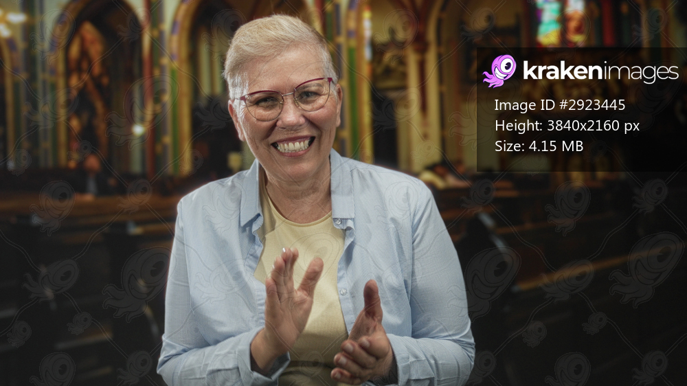 Middle age woman clapping hands inside a catholic church building, smiling to camera in eyeglasses and light blue shirt while seated on pews; joy celebration gratitude. - Kraken Images