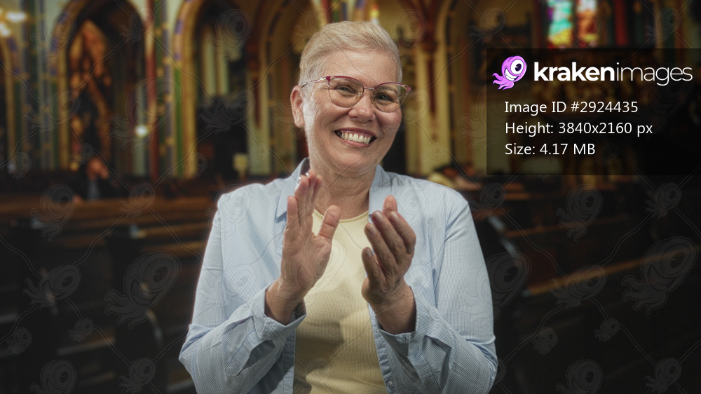 Middle age woman clapping hands inside a catholic church building, smiling to camera in eyeglasses and light blue shirt while seated on pews; joy celebration gratitude. - Kraken Images