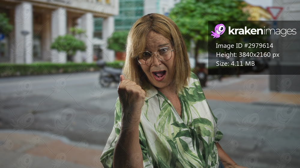 Middle age woman clenches fist in celebration, wearing glasses and green leaf shirt on a city street by a colonnade building; joy victory.