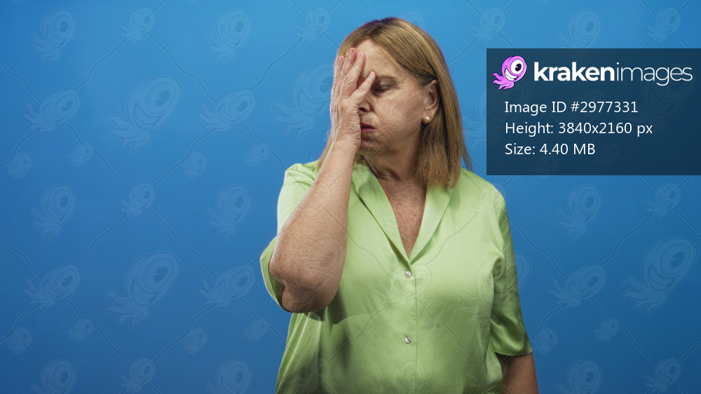 Middle age woman covers face with hand showing bare forearm against blue studio backdrop; fatigue reflection.