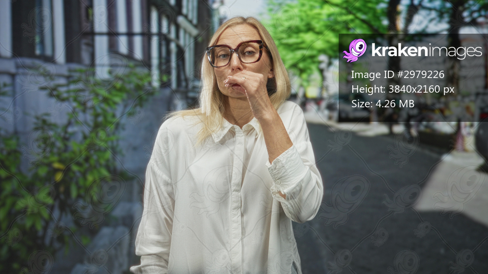 Middle age woman covers mouth with hand while wearing glasses and white blouse on a city street with trees and parked cars; surprise silence.