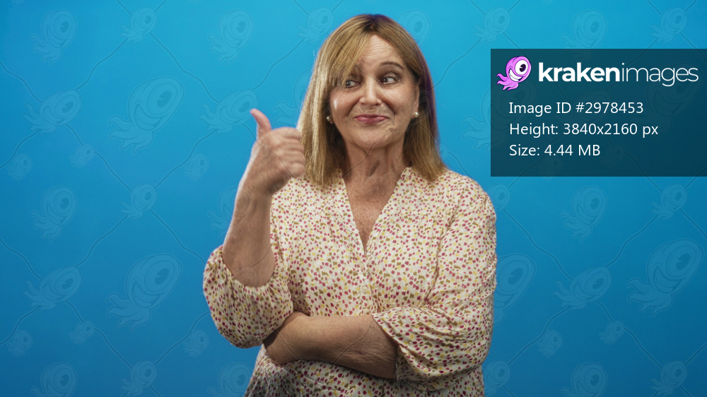 Middle age woman with crossed arms showing forearms, slight smile, looking sideways in blue studio; thoughtful reflection.