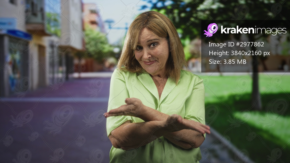 Middle age woman displays palms up hands gesture on a street near shops, blonde senior smiling and shrugging with open hands; bemused acceptance.