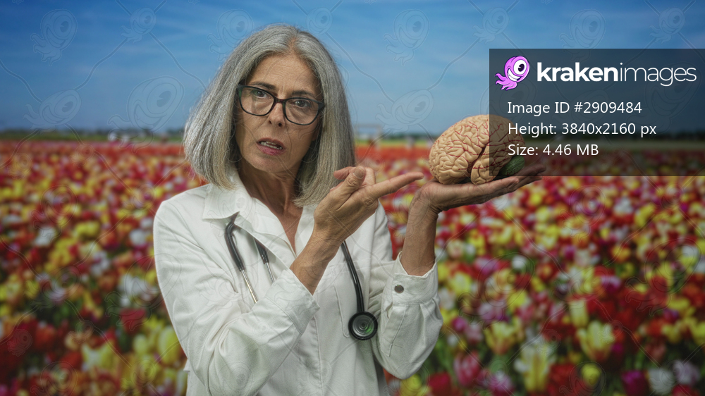 Middle age woman doctor holds brain model in both hands and points with finger in a flower field; neurology health calm.