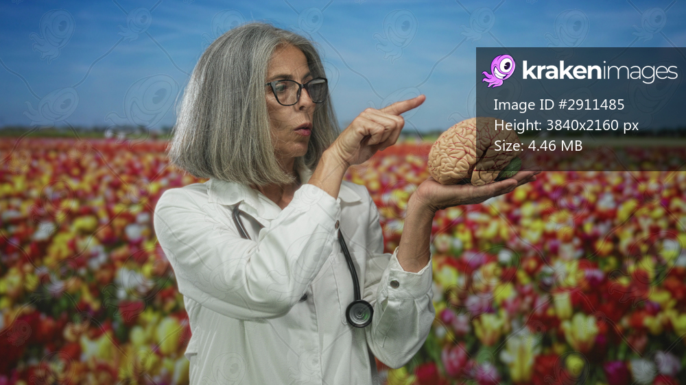 Middle age woman doctor holds brain model in both hands and points with finger in a flower field; neurology health calm.