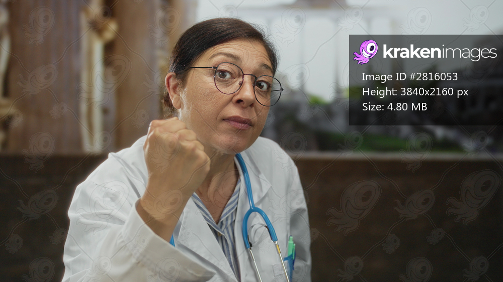 Middle age woman doctor with stethoscope pumps fist at roman ruins building in bright daylight; determination resilience.