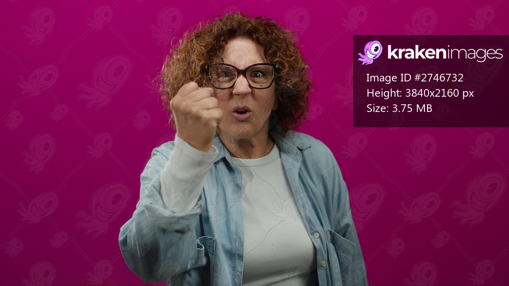 Middle age woman expressing anger with raised fist against vibrant pink background, wearing glasses and denim shirt, conveys emotion of frustration and determination. - Kraken Images