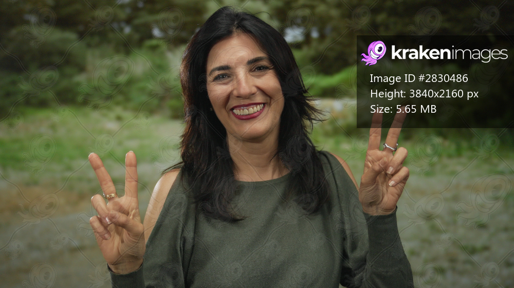 Middle age woman flashing peace sign with both hands in green park setting while smiling broadly and wearing olive shirt; joy.