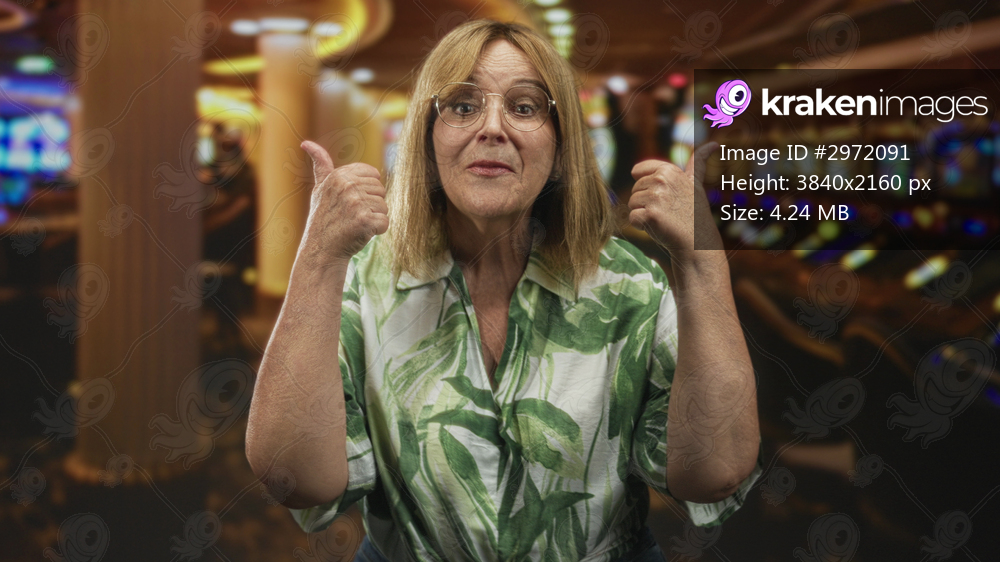 Middle age woman giving thumbs up with smile in a casino building, wearing glasses and green leaf shirt; optimism.