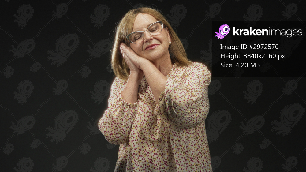 Middle age woman with glasses cups cheek with both hands, tilts head and closes eyes in studio; peaceful rest.