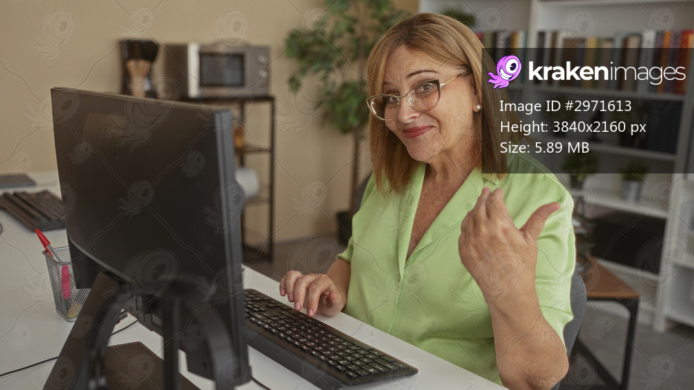 Middle age woman with glasses and green blouse typing on keyboard and gesturing with one hand while seated at desk in a building; friendly connection.
