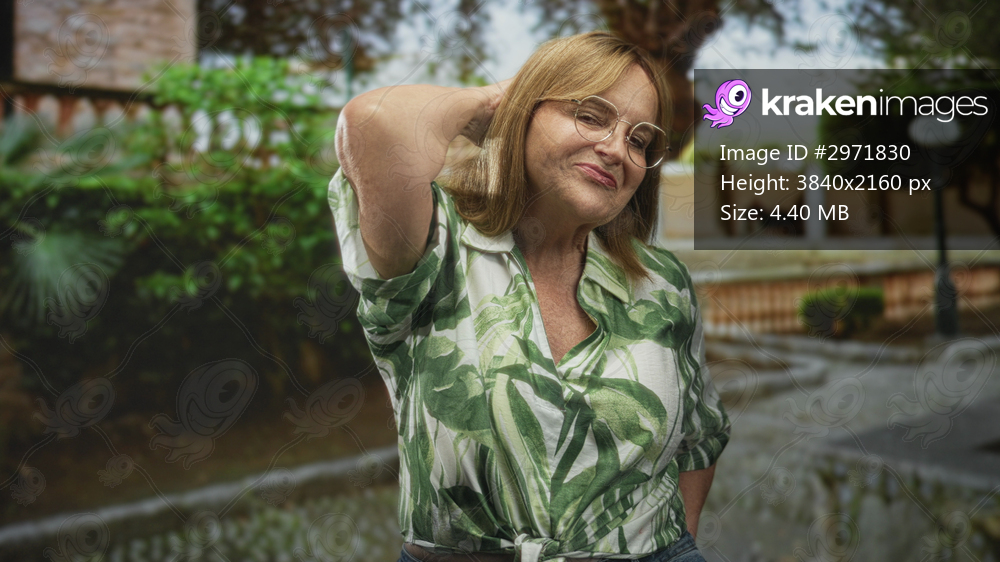 Middle age woman with glasses and pearl earring touches hair, smiles with closed eyes wearing green leaf shirt on street; serenity reflection.