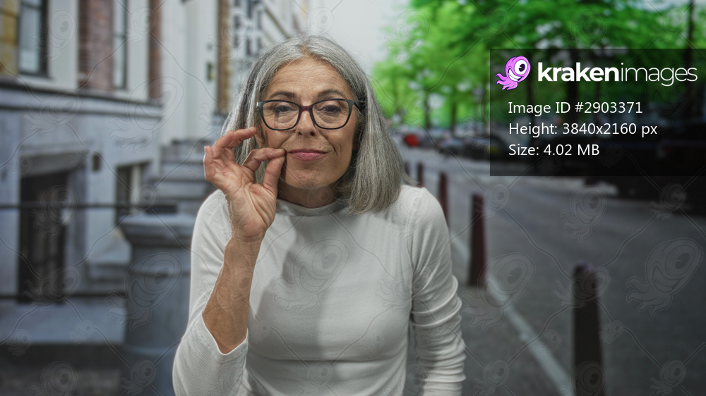 Middle age woman with gray hair and glasses making ok sign with fingers to mouth while eyes closed on a city street lined with parked cars and green trees; contentment. - Kraken Images