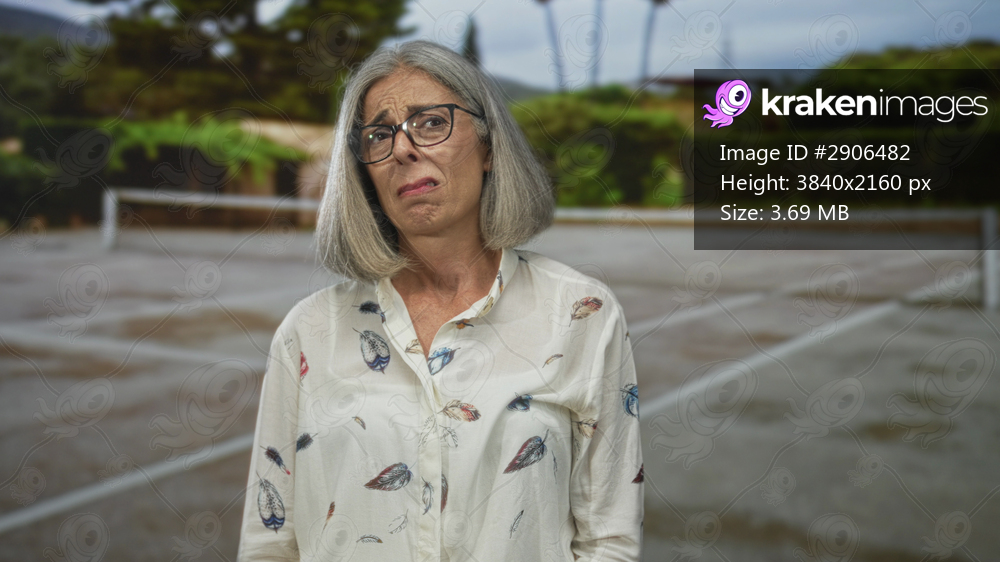 Middle age woman grimacing with glasses on tennis court street, head tilted and shoulders hunched, distant trees and fence visible; disgust resignation. - Kraken Images