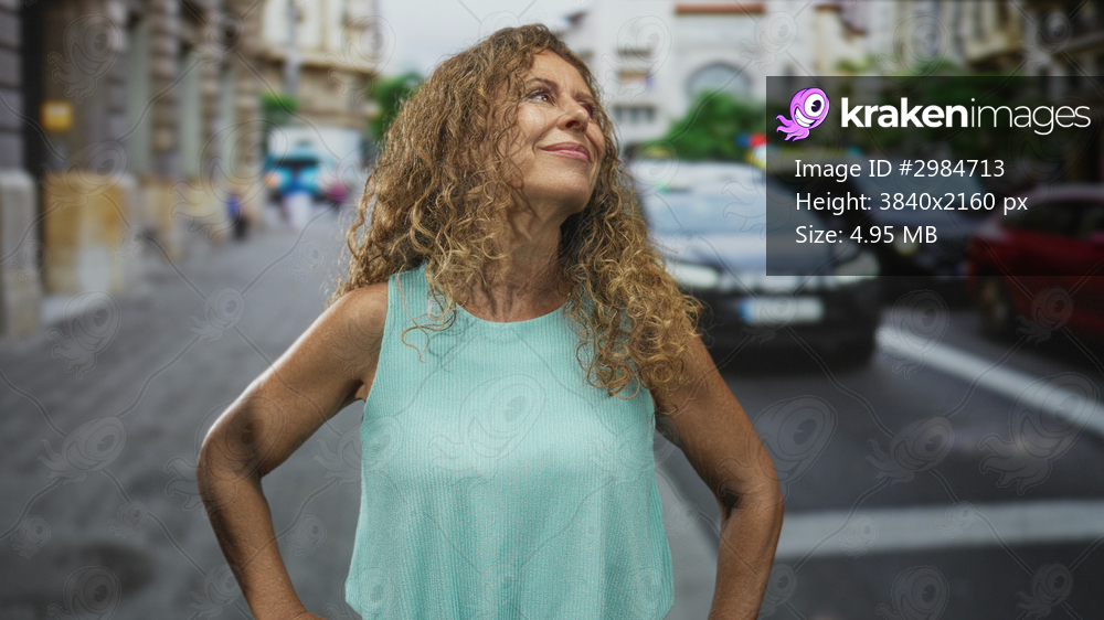 Middle age woman with hands on hips and bare arms looking up on a busy city street with cars and buildings; confidence urban travel.