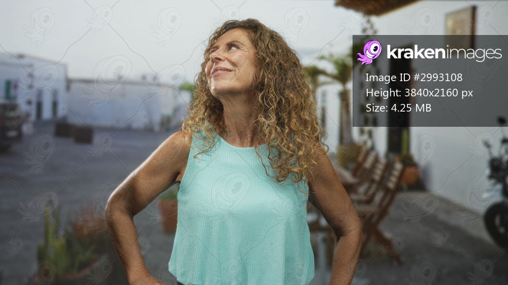 Middle age woman with hands on hips looking up and smiling on a sunlit street near white buildings; confidence optimism.