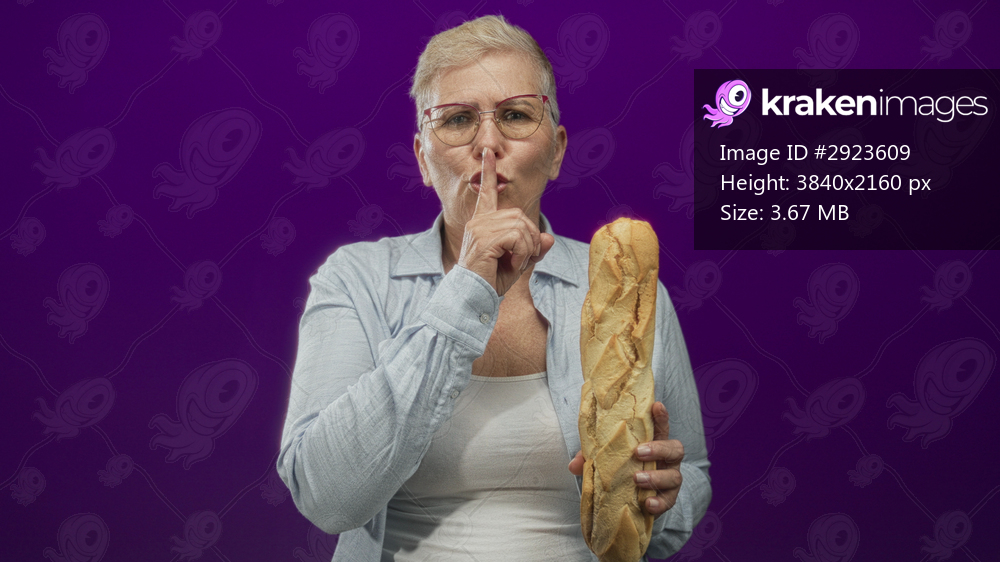 Middle age woman holding a baguette, finger to lips for silence, wearing glasses and white tank top in purple studio; silence secret.