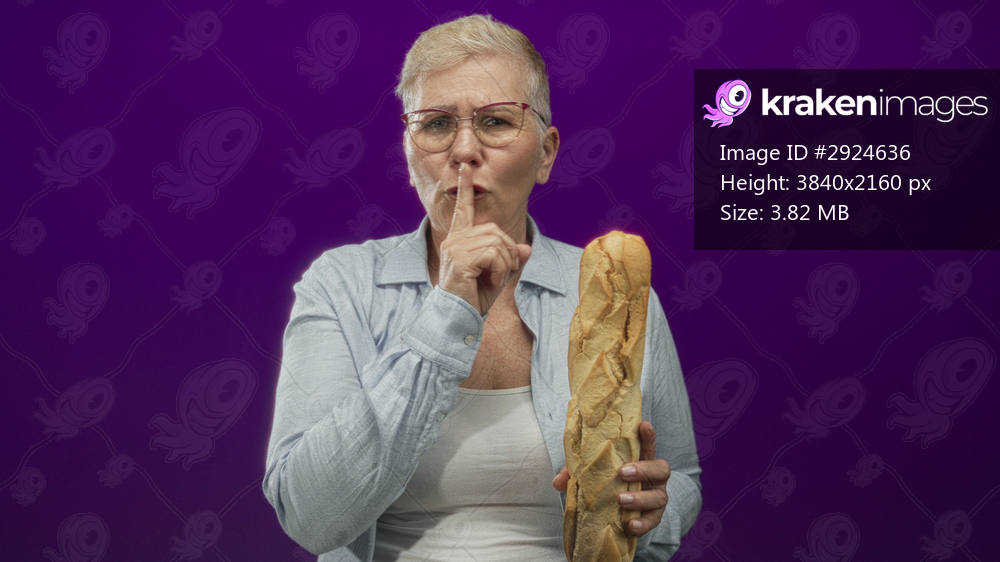 Middle age woman holding a baguette, finger to lips for silence, wearing glasses and white tank top in purple studio; silence secret.