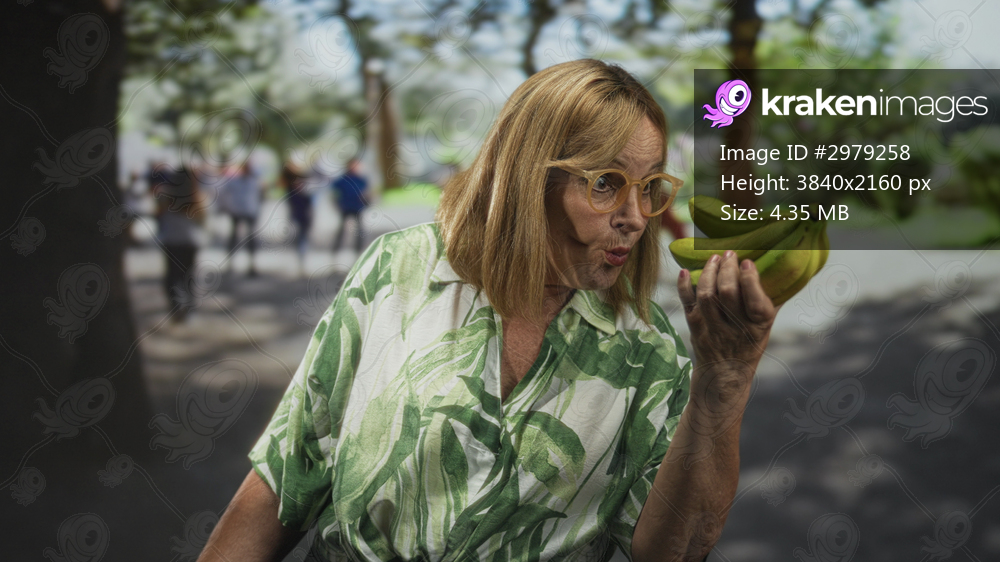 Middle age woman holding a bunch of bananas, puckering her lips while inspecting the fruit on a tree lined street; curiosity moment.