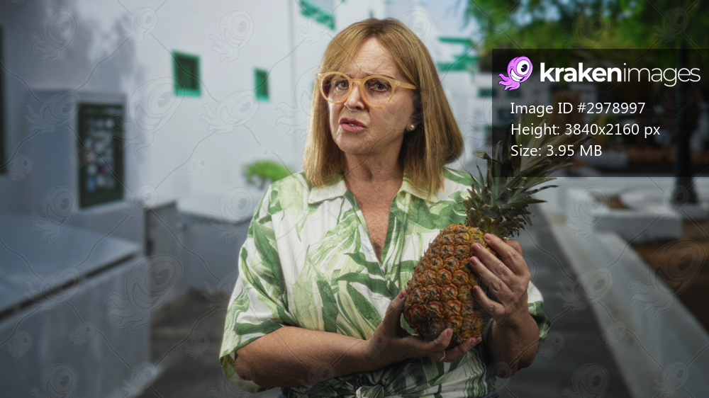 Middle age woman holding a ripe pineapple with a puzzled grimace in front of a white building; skepticism.
