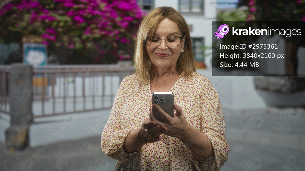 Middle age woman holding a smartphone and tapping its screen, smiling with glasses while standing on a sunny street near flowering bougainvillea and a railing; calm contentment. - Kraken Images