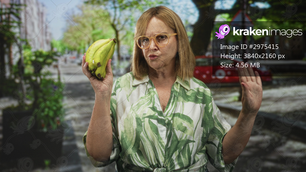 Middle age woman holding bananas with palm raised in a questioning gesture while inspecting the fruit on a street scene; skepticism indecision.