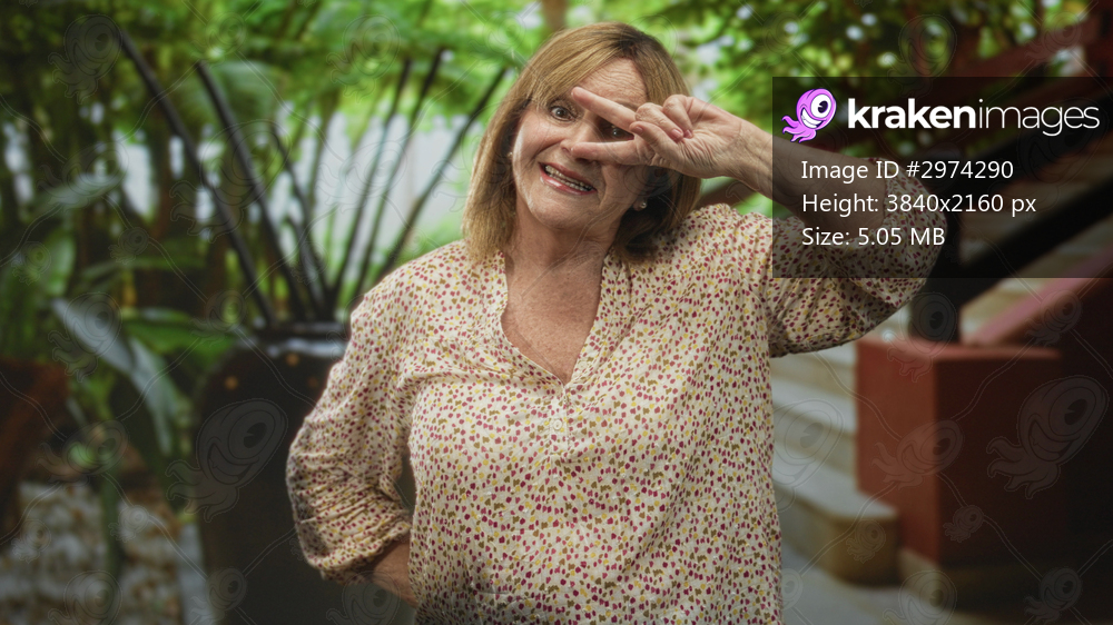 Middle age woman holding peace sign with hand over eye and smiling near stairs and plants in a building courtyard; cheerful playfulness.