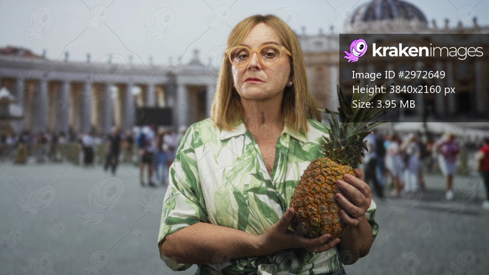 Middle age woman holding pineapple with hands in front of historic building piazza, wearing glasses and green shirt, stern gaze; defiance travel memory. - Kraken Images